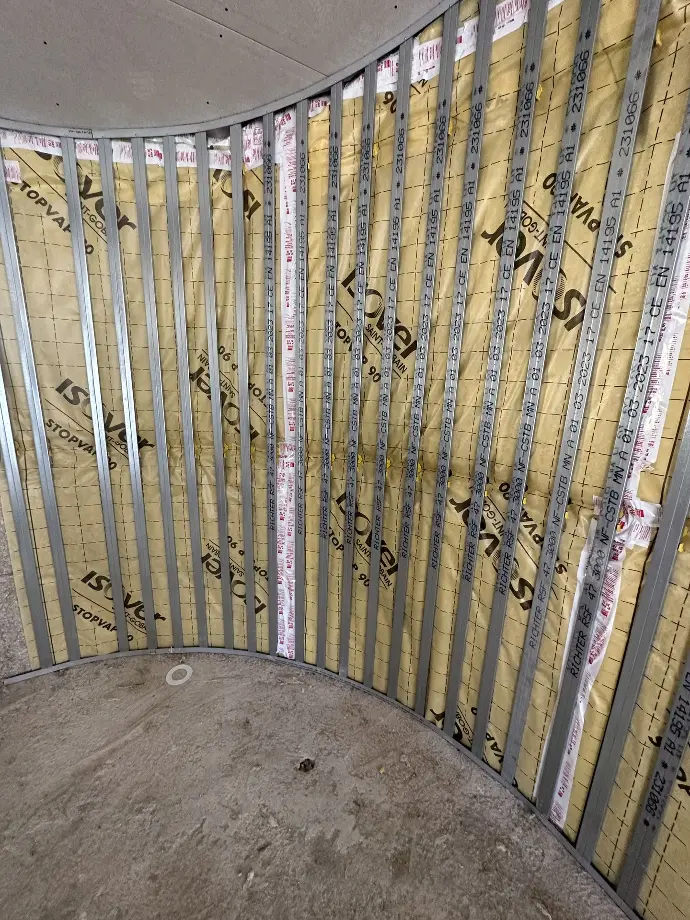 Pose d’un pare-vapeur avec isolant écologique, réalisation de doublages et finition avec corniche décorative